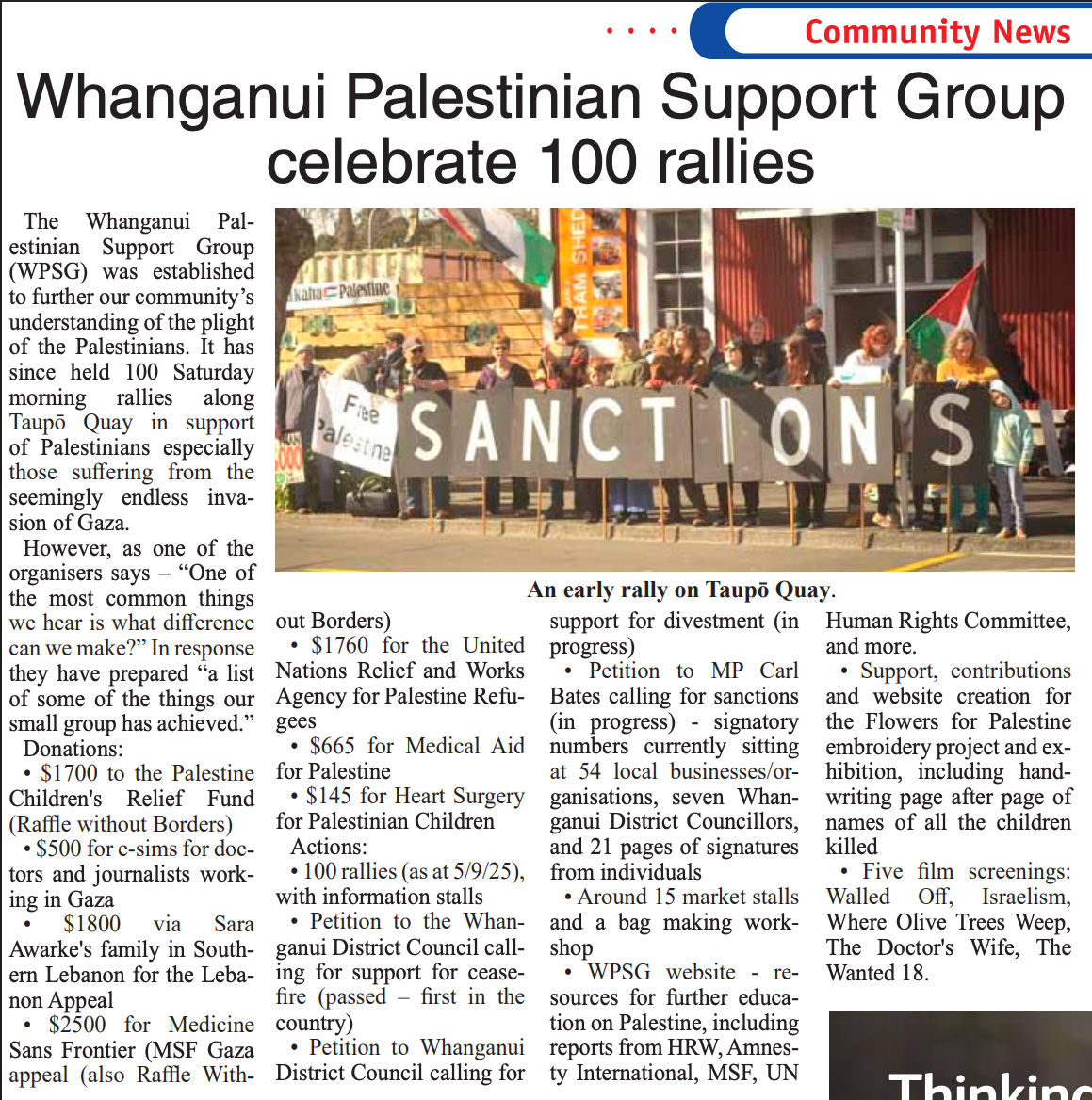 We are a small but mighty group of peaceful activists intent on promoting advocacy, solidarity, education and boycotting campaigns for the Palestinian cause in our Whanganui community.