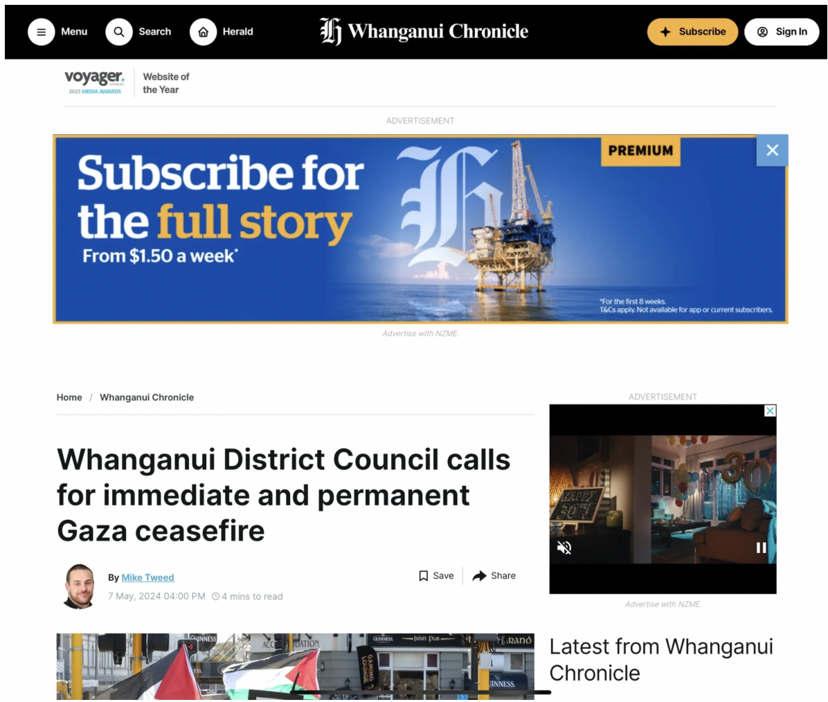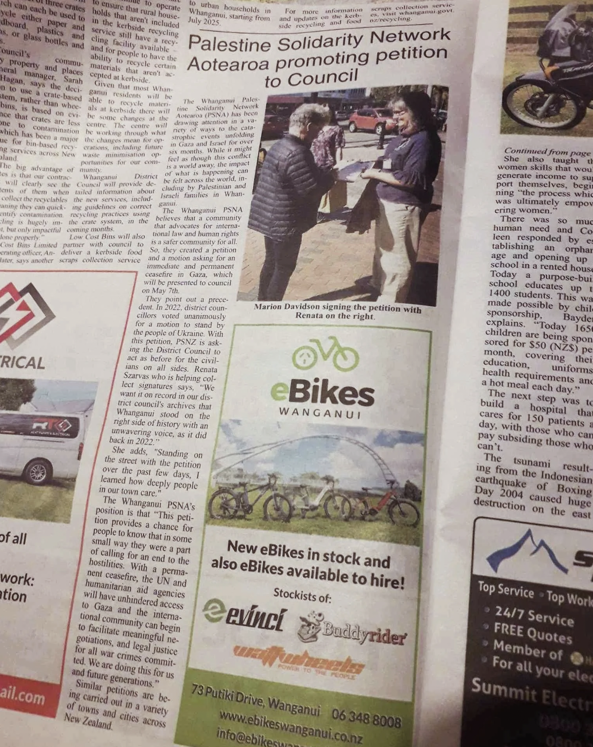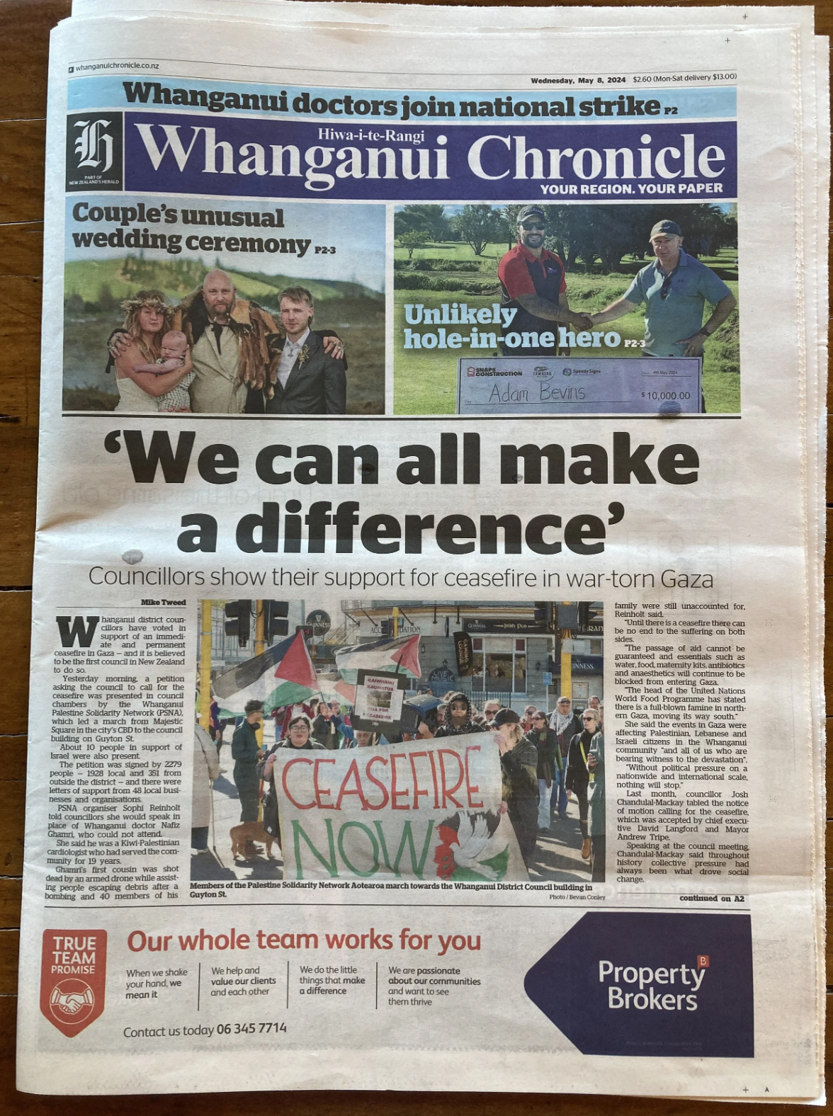 The decision came after the Whanganui Palestinian Solidarity Group peacefully marched to the meeting and presented councillors with a petition with more than 2,000 signatures. After the petition was presented, Councillor Josh Chandulal-Mackay moved a notice of motion calling for an immediate and permanent ceasefire, seconded by Councillor Charlotte Melser.